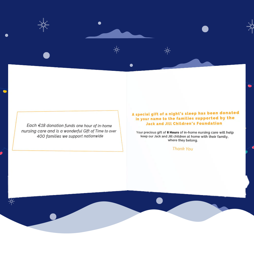 Jack and Jill’s mission is to empower families to care for their child at home, by funding and delivering nursing, respite and advocacy. Each €18 donation funds one hour of in- home nursing care and is a real ‘Gift of Time’ to the 400+ families supported by Jack and Jill, right around the country.